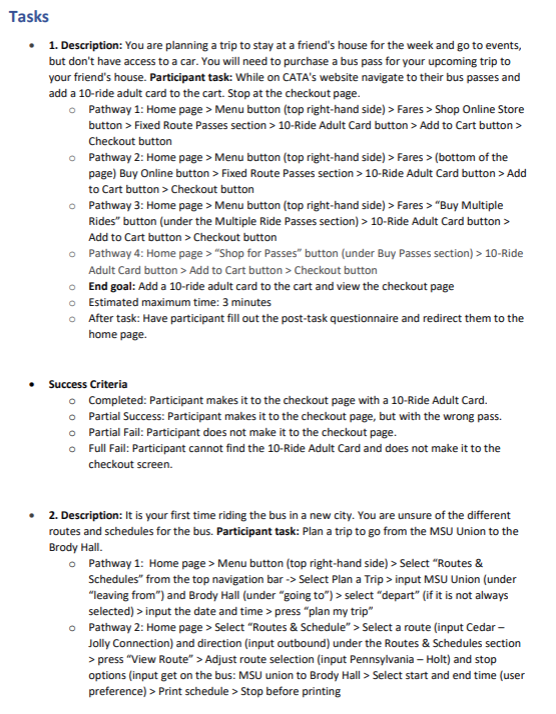 We conducted our remote usability tests via Zoom. I conducted the test with a participant who is not a CATA rider. The session lasted approximately 35 minutes and the tasks that were evaluated were: