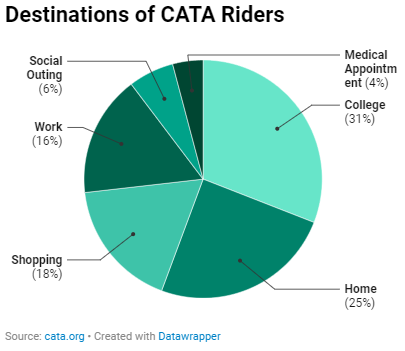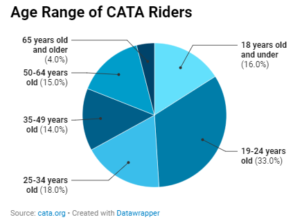 I collected data about the demographics of the population who ride the bus. I pulled data from three sources: CATA's website, DataUSA, and the U. S. Census Bureau. During my search of CATA's website, I found 6 articles and the 2023 Community Report which detailed the demographics of their passengers.