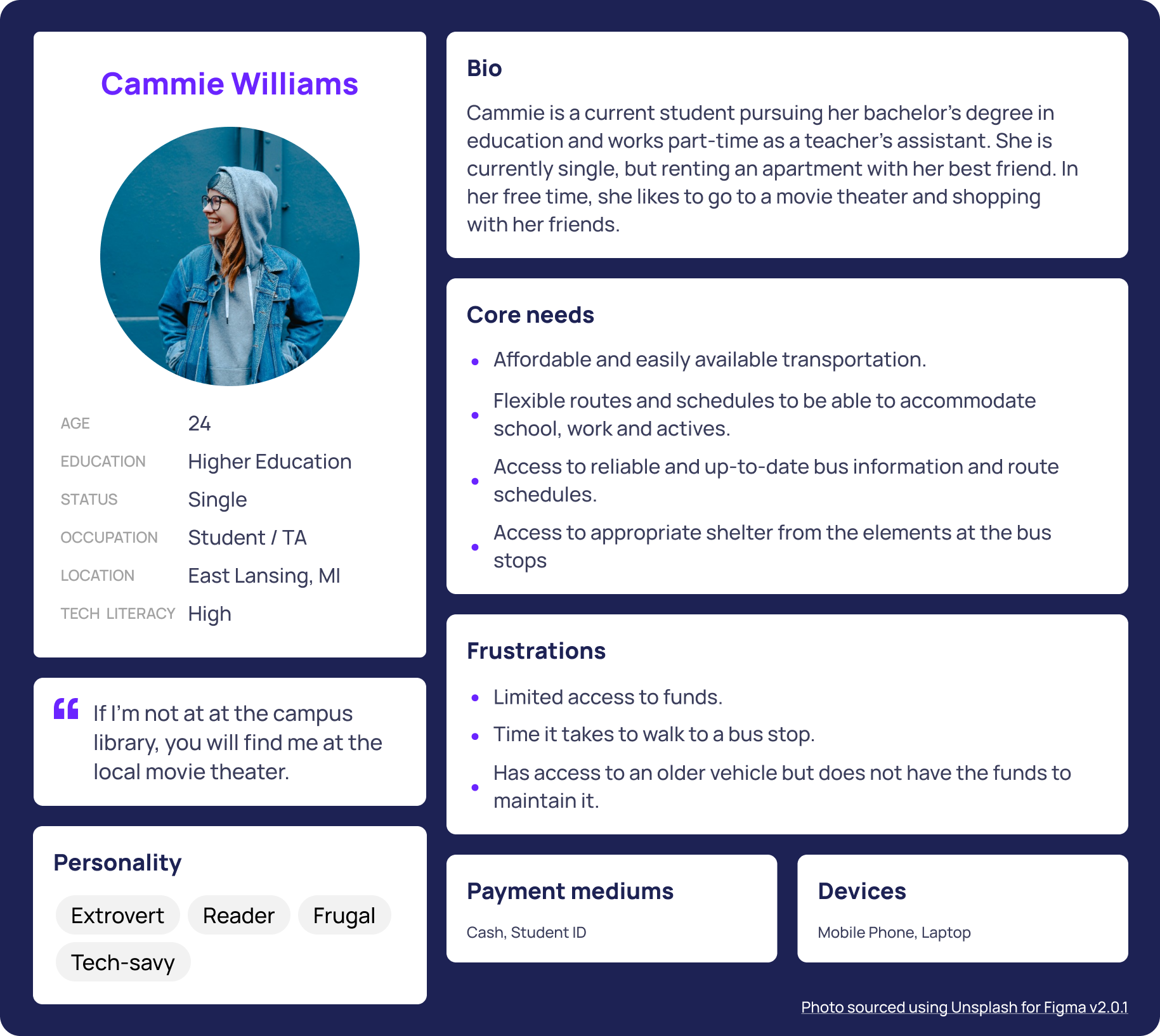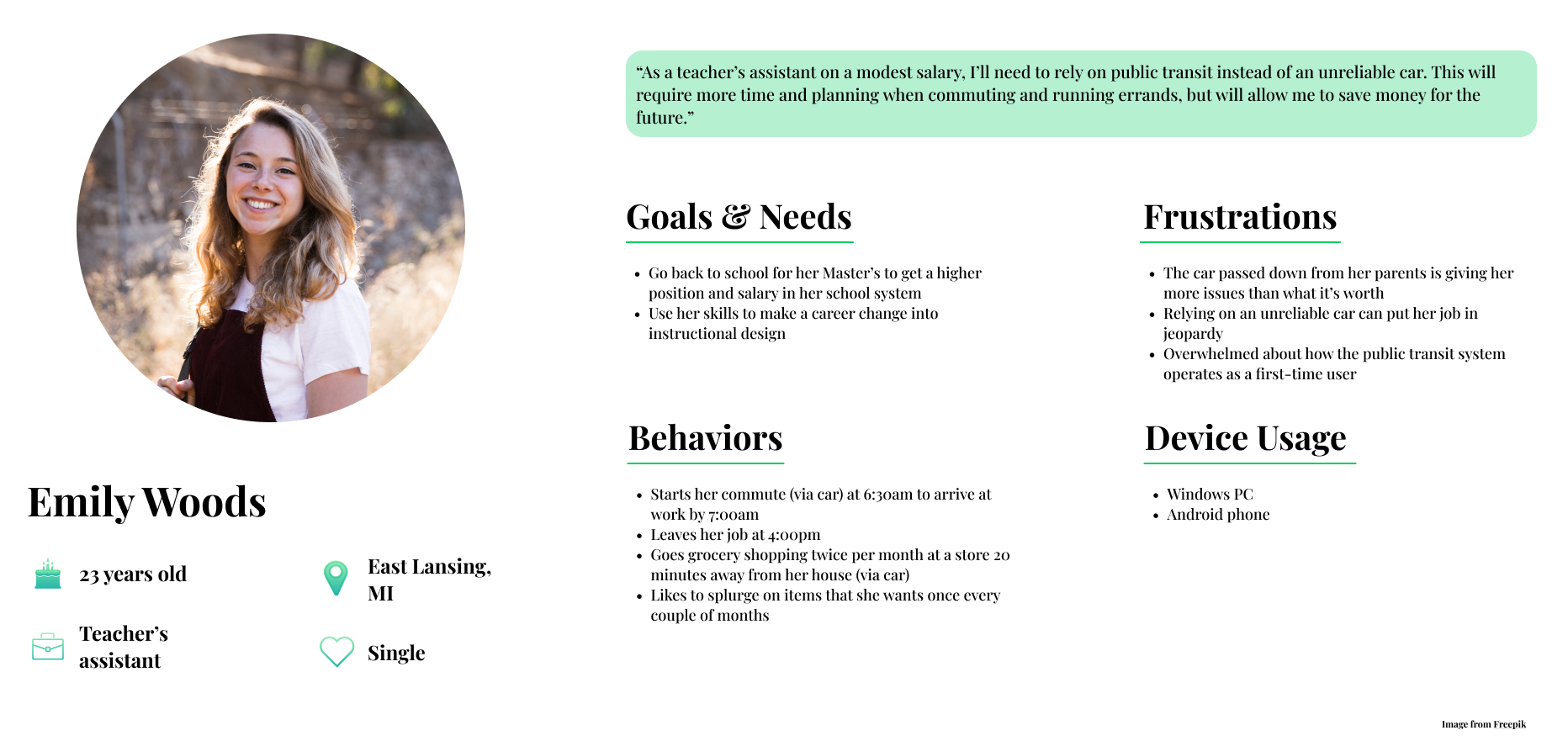 In our personas, we made noted that the core needs for the college student were affordable and accessible transportation, flexible routes to accommodate their busy schedule, access to reliable information about the bus schedules, and access to appropriate shelter for the elements. We also made this persona in-tune with current technology and trends, as she is a college student who knows how to navigate her way around most websites. That said, she is riding the bus because she has limited access to funds and cannot maintain her old vehicle passed down from her parents.