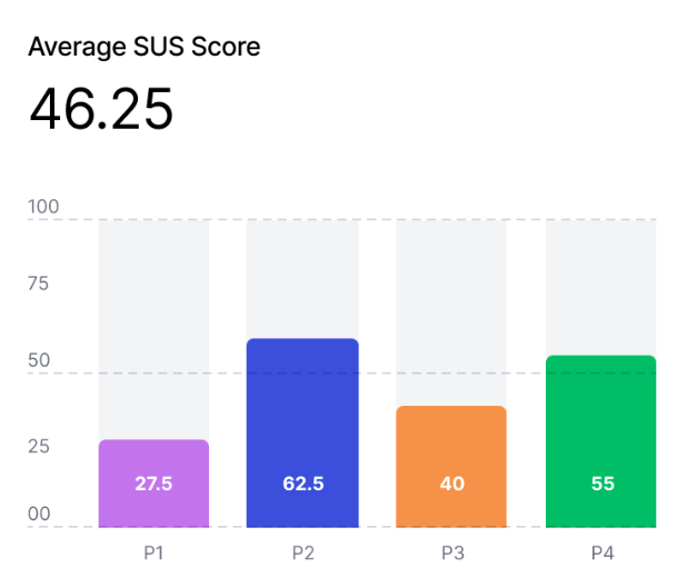 The average SUS score for the CATA website is 46.25, which falls 21.75 points below average and [68] the cut-off score considered acceptable. However, this doesn’t necessarily guarantee high acceptability when the website is used in context by users on their own. Individual participant scores are shown in the figure above.
