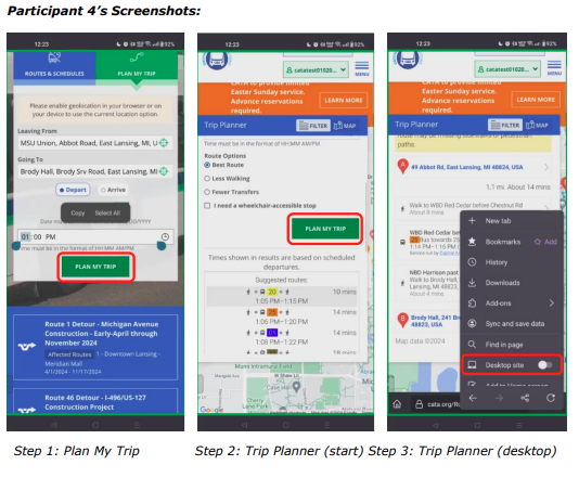 Participants were confused about how to access the full map below the trip planner overlay. Participant 4 tried switching to desktop view on their mobile phone, but this did not meet their expectations as the map was still inaccessible.
