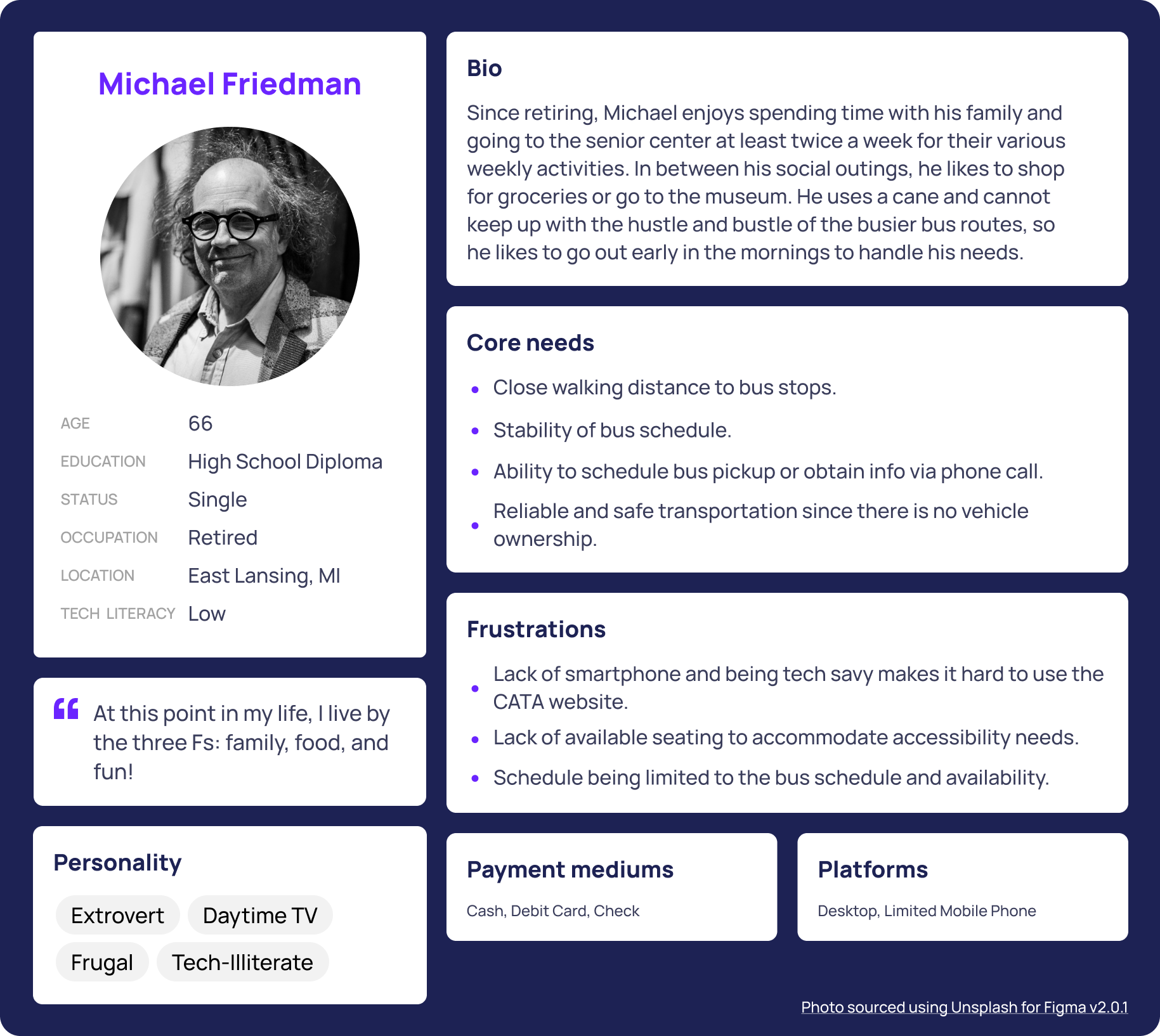 In our retiree persona, we noted that mobility and accessibility were prominent issues to touch on. Bus stops being within a reasonable distance from popular sites, stability of the bus schedules, and the ability to obtain information via phone calls were some of the core needs of this persona. He rides the bus because his disability does not allow him to drive anymore. He does not use a smartphone very often, so getting the information he needs to navigate the city should be easy for him.