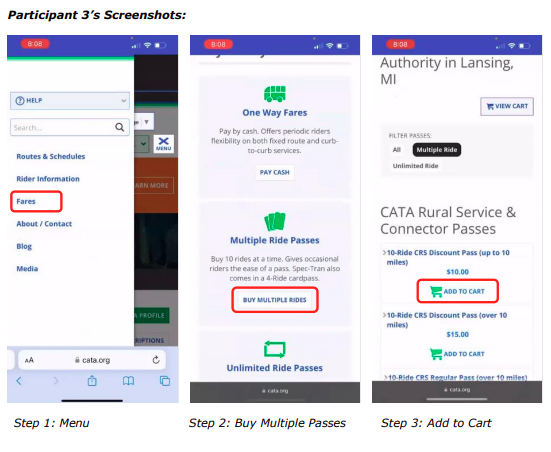 Participants struggled to find the 10-ride adult card and encountered unclear labeling and descriptions for the multiple bus pass options. They also had trouble accessing the cart.