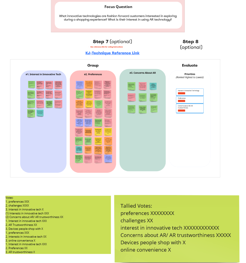 Based on our focus question 1 and votes, we determined that our top 3 priorities were: interest in innovative tech, preferences, and concerns about AR.