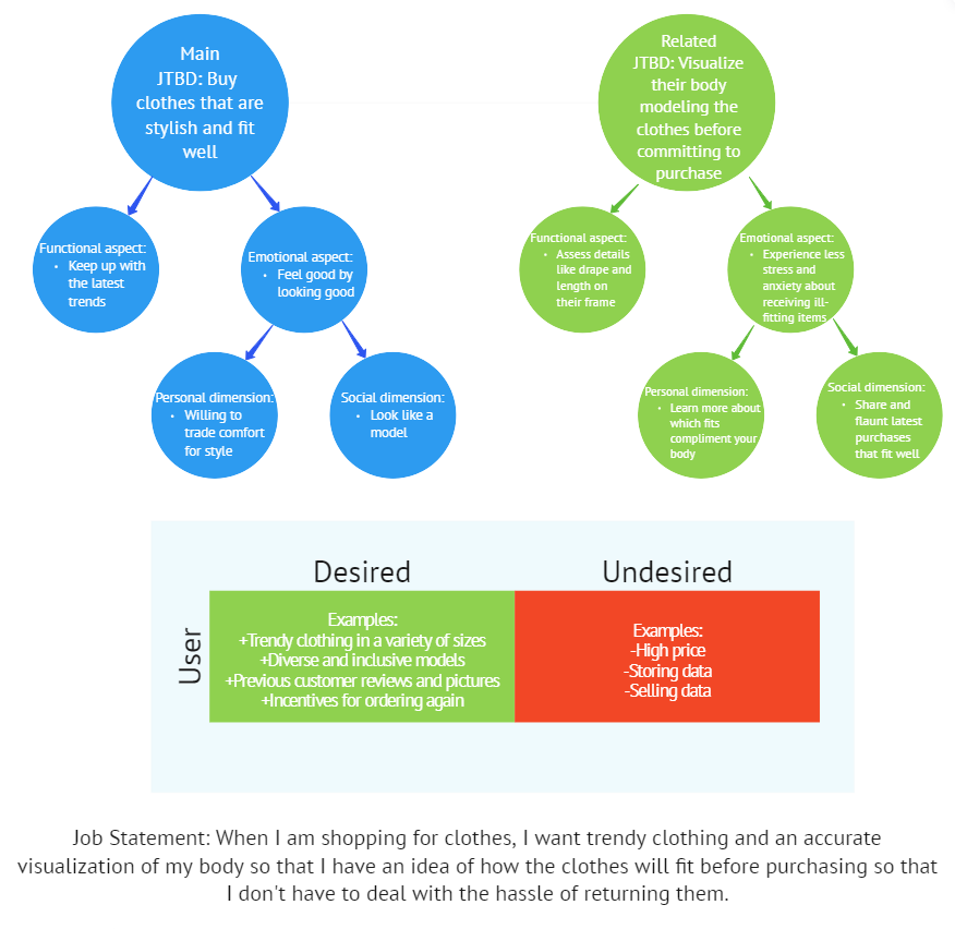 The design team is looking to assess the likely suitability of AR on mobile devices to improve upon the current user experience, so to help them in this quest, I created a Jobs to be Done (JTBD) framework. I chose a JTBD because there is no industry standard regarding the use of AR in fashion retail and according to the Nielson Norman Group, “the JTBD framework suggests that innovation and good design come from assessing the customers’ real needs, and creating a solution that is unencumbered by the existing products that fulfill those needs” (NNGroup). Due to the JTBD framework that I created, the designers will know what the users truly need so that they can create a product that solves the user’s problem based on functional and emotional success criteria. For example, the designers can take into account that the users would like diverse and inclusive models in their decision-making.