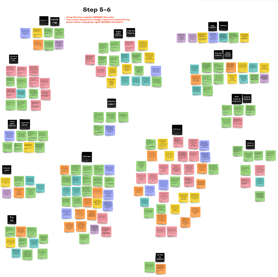 We grouped items together based on similarities and categories. Our categories were: demographics, interest in innovative tech, devices, consumer loyalty, try-on, shopping preferences, support, challenges, convenience, customer satisfaction, shopping frequency, and concerns about AR.